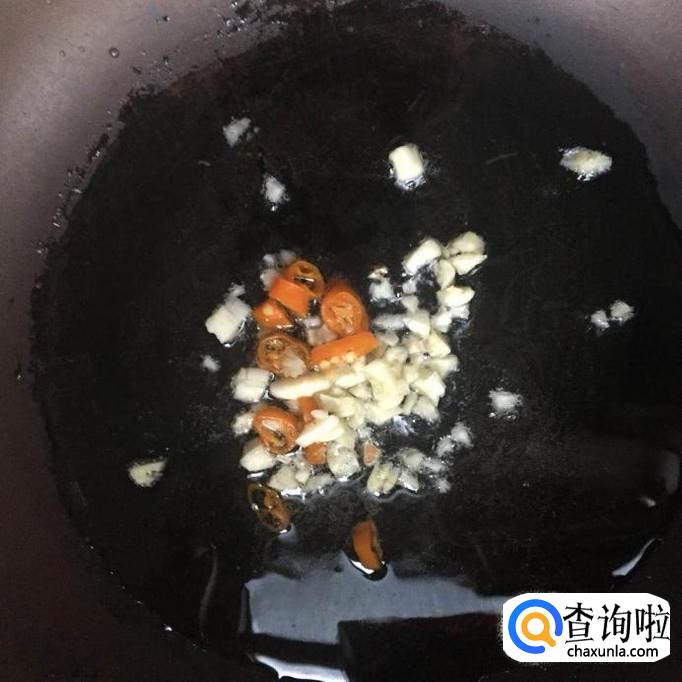 然后把辣椒和蒜头倒入油锅中爆香,如下图所示。