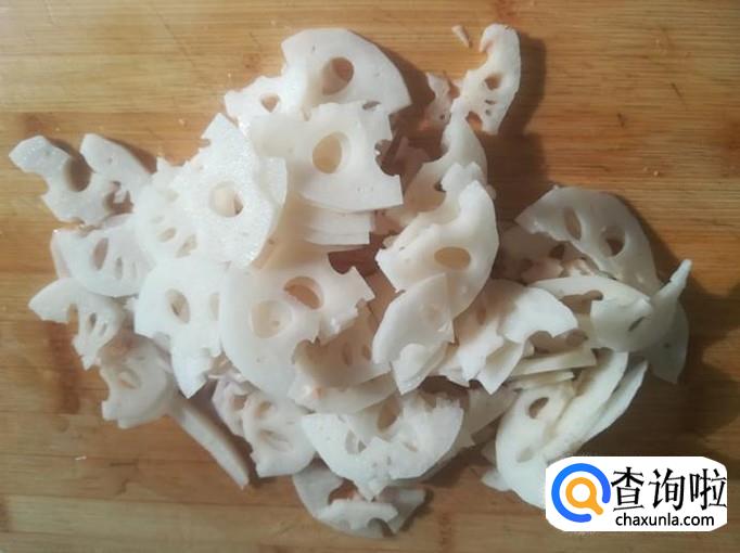 把莲菜去皮,洗净切四瓣,在改刀切成薄片。