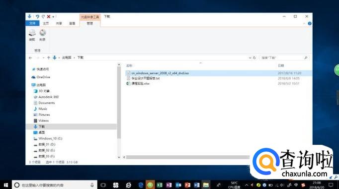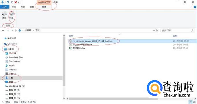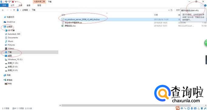 如图所示,展开"下载"文件夹。选中"cn_windows_server_2008_r2_x64_dvd.iso"镜像文件,点击功能区右侧向下箭头。