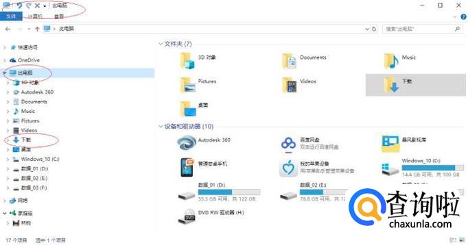 唤出"资源管理器"程序窗口,如图所示。展开左侧树形目录结构,选择"此电脑→下载"文件夹。