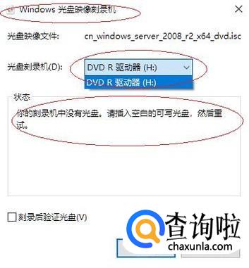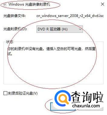 如图所示,弹出"Windows 光盘映像刻录机"对话框。点击"光盘刻录机"文本框向下箭头,选择刻录机并插入空白的可写光盘。