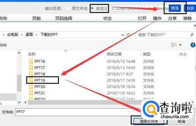 然后就给转换后的ppt设定保存地址,鼠标左击上方的【自定义】按钮,再左击右侧的【浏览】选项,紧接着在跳出的窗口内找到保存的文件夹且鼠标左击选项,之后就点击窗口右下角的【选择文件夹】选项,这样保存ppt的地址就设定完成。