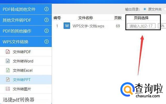 紧接着使用鼠标左击【页码选择】,在页码选择下方中输入这份wps文件中要转换为ppt的页面页码数,倘若全部都需转换则输入全部。