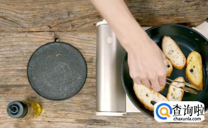 起油锅,将切片的法棍双面煎至金黄。