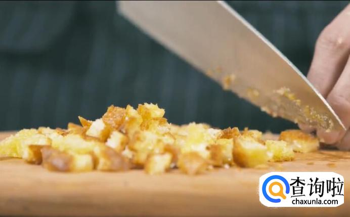 煎好的法棍切成小丁待用。