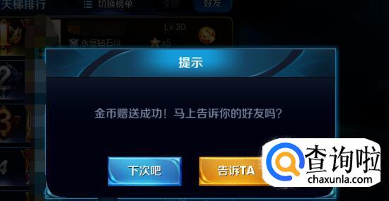 点击金币图标后就赠送成功了。你可以选择告诉好友,这样好友能收到获赠提示,也可以直接选择“下次吧”。