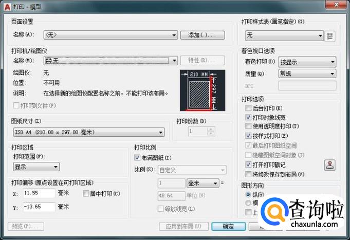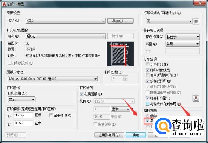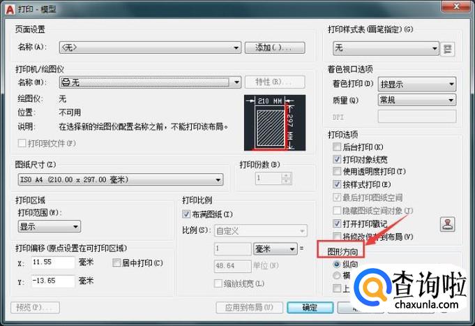 在打印-模型对话框内我们可以找到图形方向选项,默认的图形方向为纵向,如图所示: