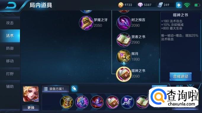 接着出噬神之书,噬神之书主要是提供法术吸血,对法术伤害的提升作用不是很明显,如果铭文全带的吸血的话可以考虑把这件装备换为梦魇,制裁对面的射手;接着是虚无权杖,配合妲己被动打坦克有奇效;最后大件出贤者之书,增加400的法强,被动增加1400的最大生命值,增加了妲己的输出能力和生存能力。
