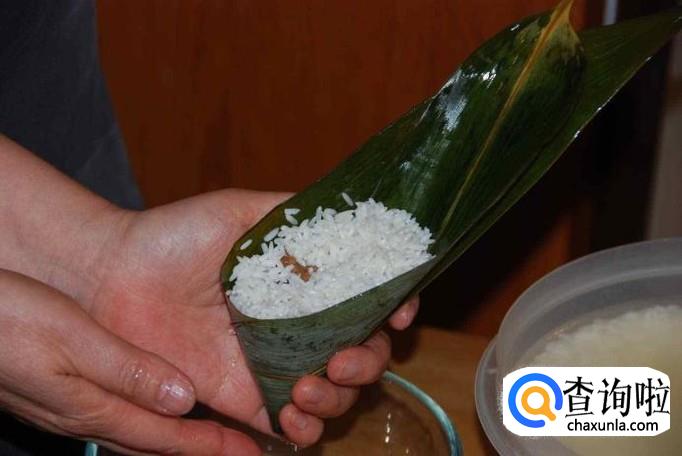 最后我们就可以把煮好的粽子折成漏斗状,把糯米放入漏斗里每个粽子里面加入一两个红枣就可以,红枣起点缀作用,然后用粽叶把糯米包好用粽绳固定就可以了。