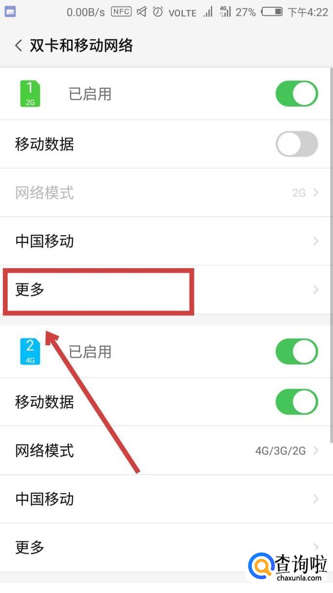 然后选择需要设置的SIM卡,点击“更多”,如图所示。