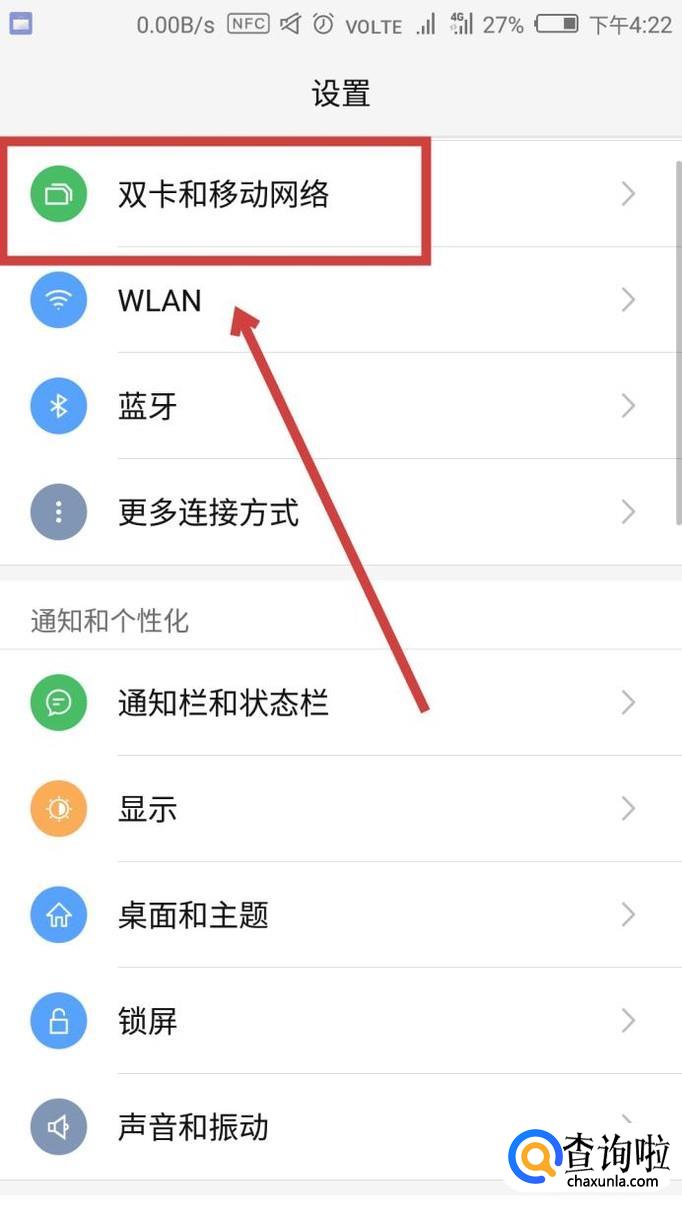 打开“设置”,在最上方找到“双卡和移动网络”,点击进入。