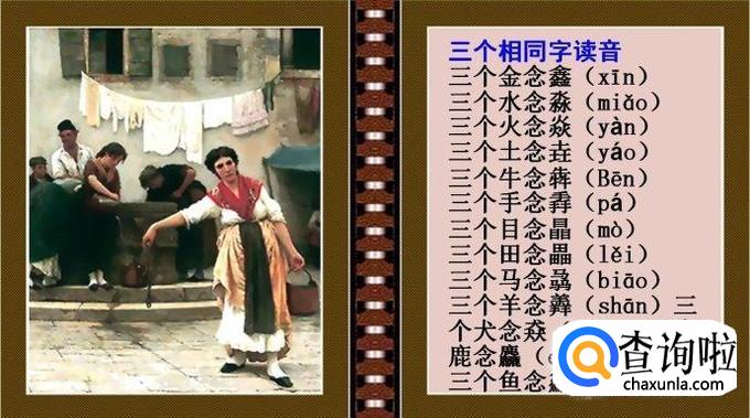 三个金念鑫(xīn) 三个木念森(sēn ) 三个水念淼(miǎo) 三个火念焱(yàn) 三个土念垚(yáo) 三个牛念犇(bēn) 三个手念掱(pá) 三个目念瞐(mò) 三个田念畾(lěi) 三个马念骉(biāo) 三个羊念羴(shān) 三个犬念猋(biāo) 三个鹿念麤(cū) 三个鱼念鱻(xiān)