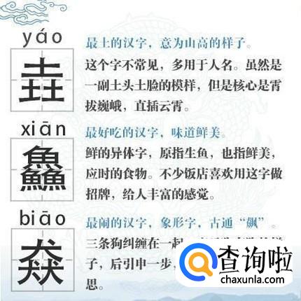 再比如三个土,垚,不光有土里土气的意思,最重要的是还有霄拔巍峨,直插云霄的意思。这些我们都要认真去体会。