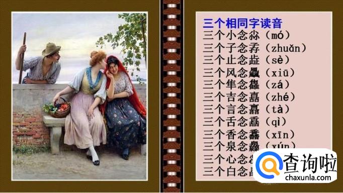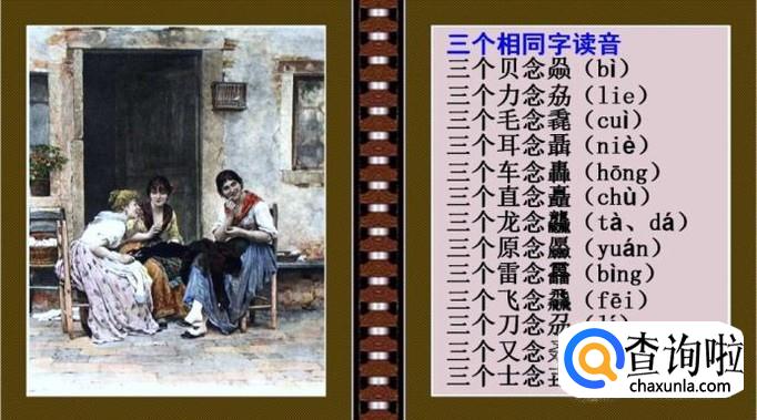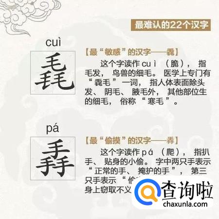 除了认识这些汉字,还要了解他们的意思,比如,三个毛毳念:cui,指的是毛发,鸟兽的细毛。也指的是人体表面除了头发,阴毛,腋毛外,其他部位生的细毛。