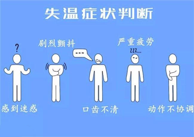 当人体体温在35℃以下时,就会发生中度甚至更严重的失温,这时必须立即处理,否则可能会有生命危险。失温可分为四个阶段,一轻度失温体温37°C–35 °C,人体会产生颤抖,双手麻木,无法完成复杂动作。二中度失温体温35°C–33 °C,会出现意识茫然,动作协调性开始丧失。三重度失温体温33°C–30 °C,会说话困难,思维迟钝并开始健忘。四死亡阶段体温30 °C以下,暴露的皮肤变蓝、涨大,肌肉协调能力几乎完全丧失。