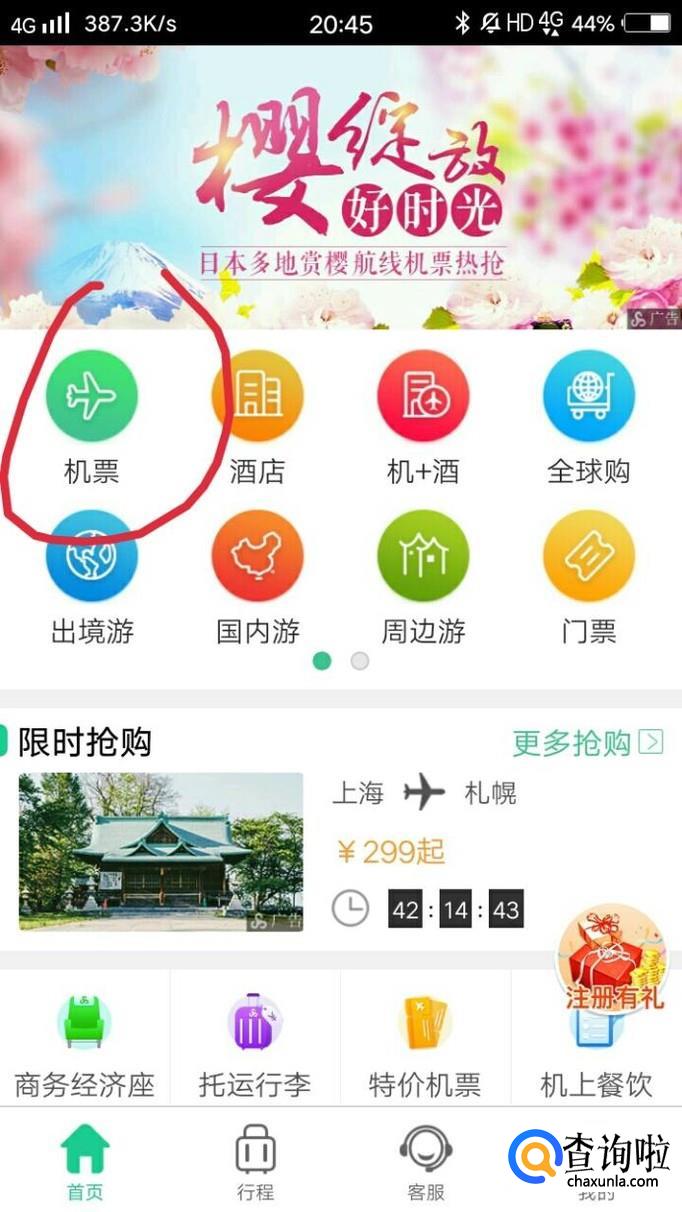 打开春秋航空app后,点击机票。