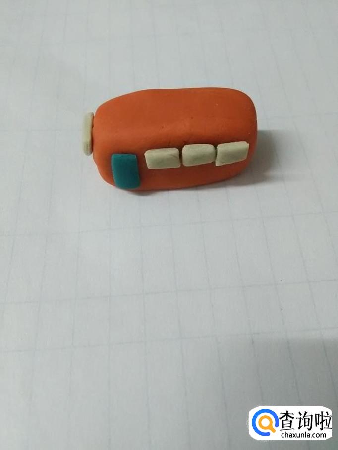 用白色捏四个长方形,在车身左侧粘一个,当作车头的车窗,然后在车身上粘三个,当作车身的车窗。