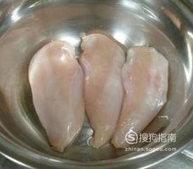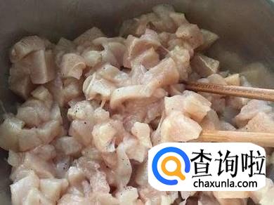 我们首先将鸡胸脯、胡萝卜、黄瓜切丁,然后把胡萝卜、黄瓜备用,把切好的鸡胸脯用料酒和盐腌制。