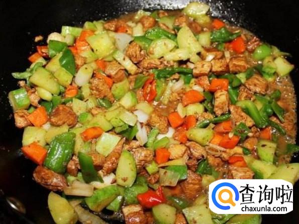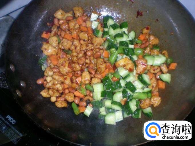 然后我们把鸡胸脯、胡萝卜、黄瓜、依次炒熟备用,然后放入辣椒酱煸炒,然后倒一碗水闷熟。