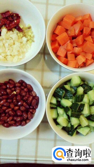 要想做好宫保鸡丁我们要准备以下材料:鸡胸脯、胡萝卜、黄瓜、大蒜、葱花、辣椒酱、料酒、盐、花生米、醋。