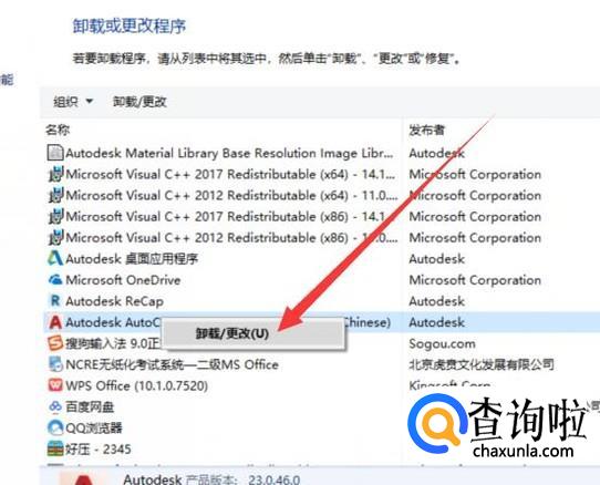 进入之后,找到“cad”,选中cad,然后右击鼠标,选择“卸载/更改”即可,如图所示。