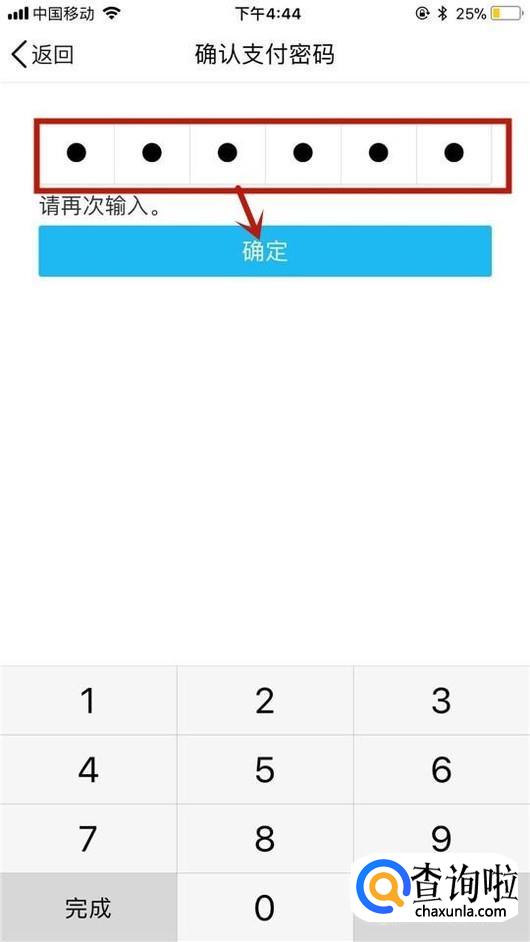 再次输入你的新的支付密码并点击确定,如下图所示。这样设置完成,我们就可以用新的支付密码来绑定新的银行卡了。