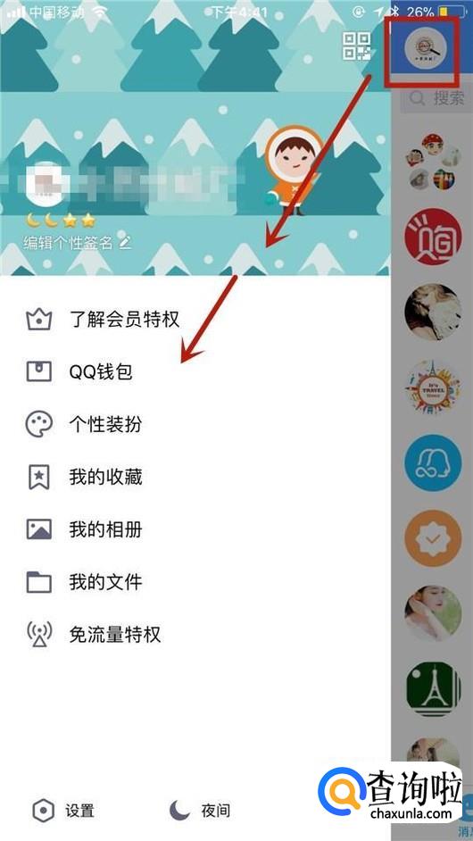 然后点击屏幕左上方的个人头像,接着点击qq钱包,如下图所示。