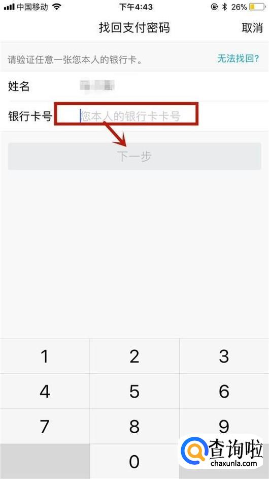 然后输入你的银行卡号并点击下一步,如下图所示。