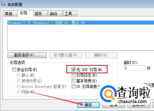在“引导”页面下面的“无GUI引导”前面打勾,然后点击“确定”就可以提升开机速度了,如下图所示。