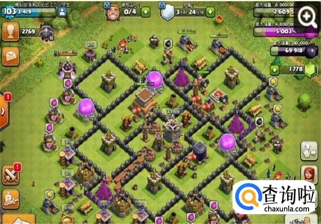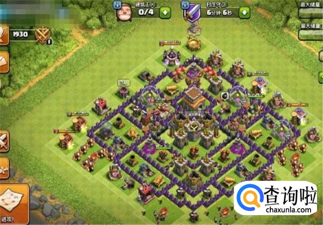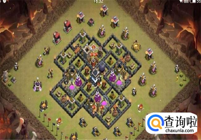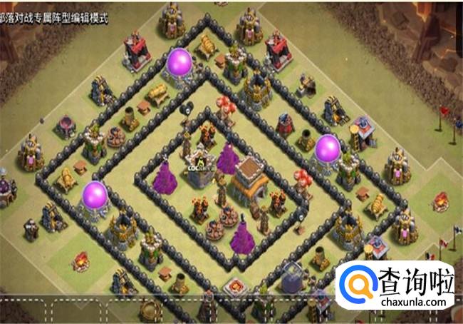 这个阵型是一个护本的阵法,将部落阵营放在中间,当敌人来袭的时候可以快速的支援,然后将圣水放在是个边上,迫击炮的覆盖范围广,所以说一般人是抢不资源的,其次防空的四个位置也是非常重要的,它们围绕在大本营的周围,可以有效地保护大本营