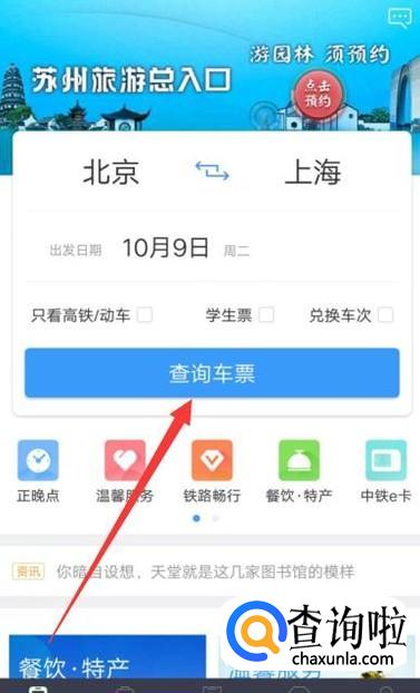 进入之后,设置好起始地和目的地,点击“查询车票”,如图所示。