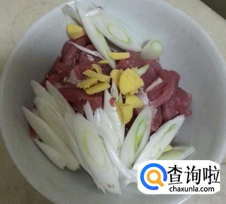 姜、蒜、葱切片,撒在切好的猪里脊上。