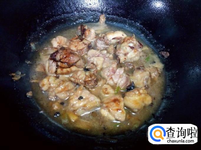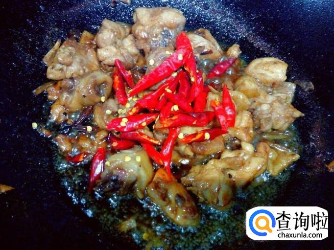 鸡腿翻炒至一分钟的时间,然后放入适量的水,略煮一下。煮至鸡腿变烂后,放入红干椒翻炒。