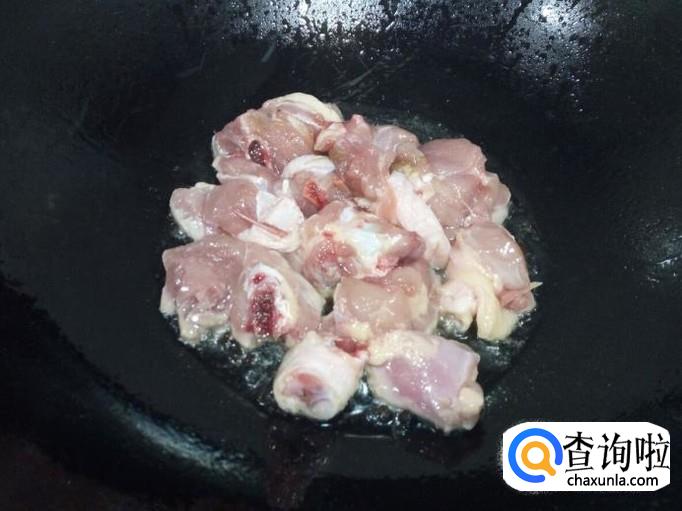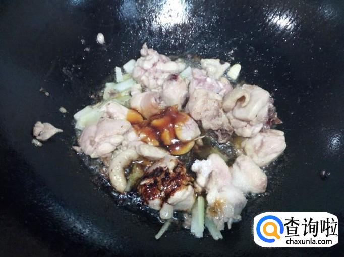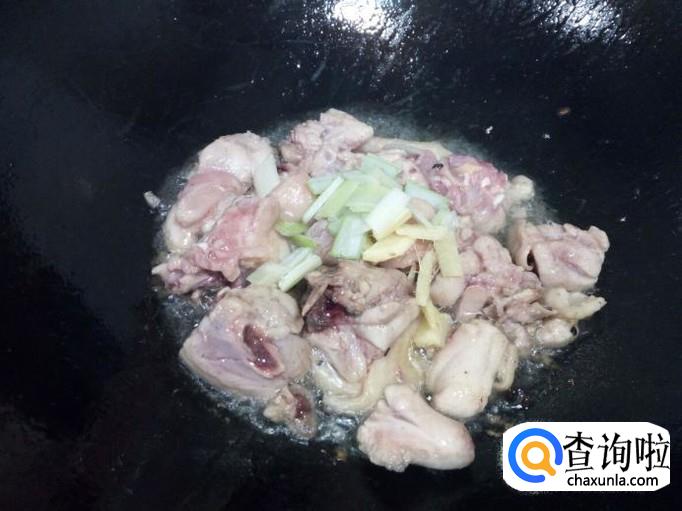 炒至鸡腿下油,颜色微白,放入葱,姜,翻炒,放入料酒,蚝油,酱油,少许白糖,盐。