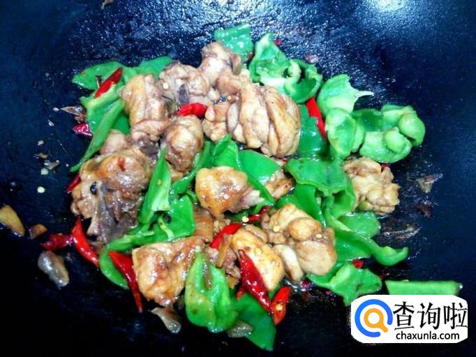 红干椒略翻炒一下,放入青椒翻炒。炒至青椒断生,放入味精,关火出勺。
