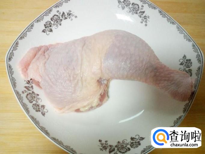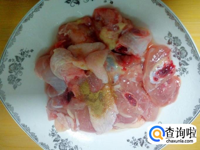 鸡腿用水清洗干净,控干水分,剁成块。放入少许盐,五香粉,料酒,腌制20分钟。
