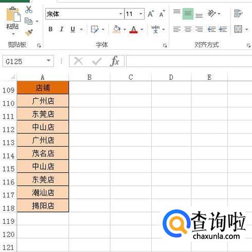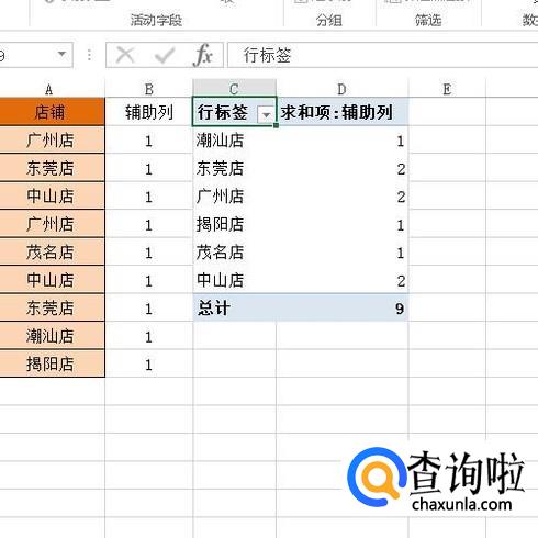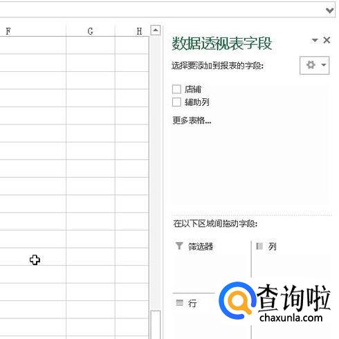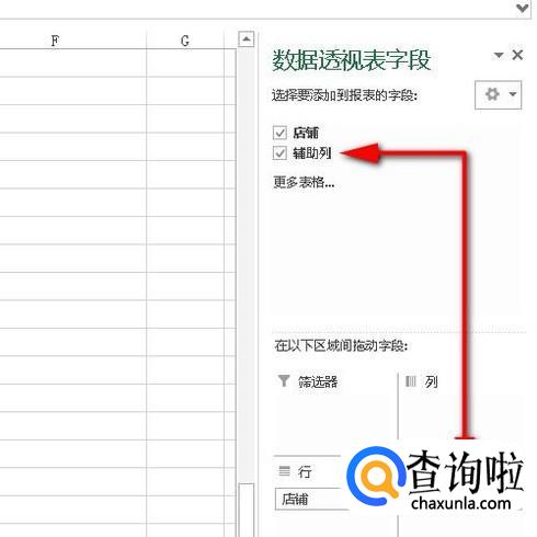 在工作表右侧这里弹出数据透视表字段。把店铺字段拉到行这里,如图所示。