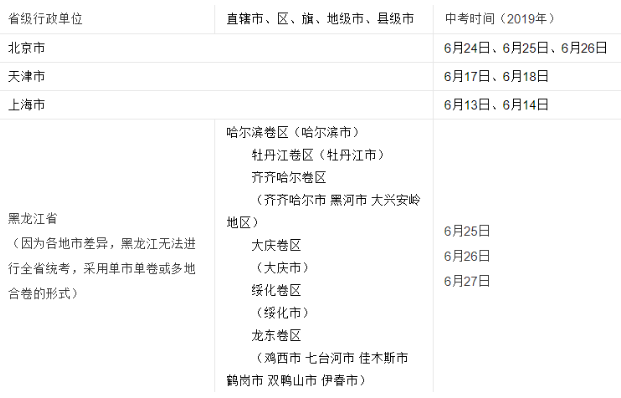 中考一般两天或者三天考完,各省时间不同。考试时间一般在六月中旬。全国省市不统一,按当地时间计算。初中学业体育水平考试一般在3-4月份举行。