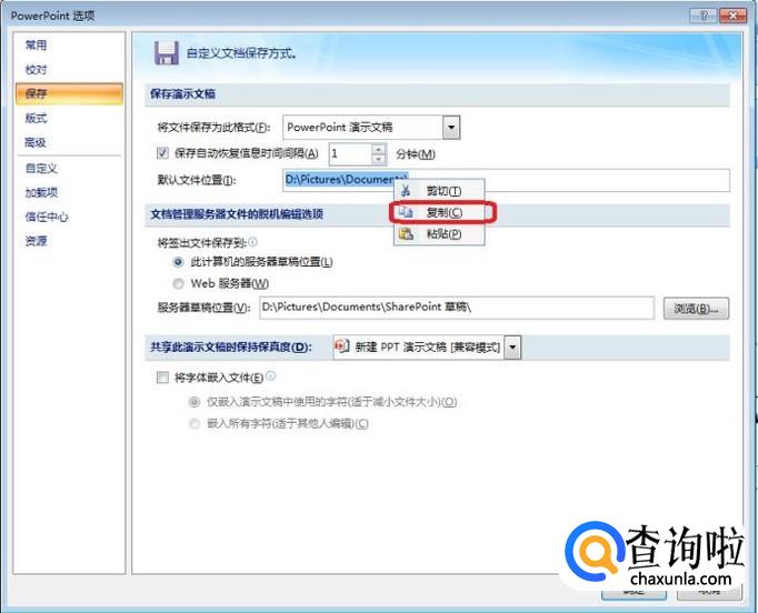 弹出如图所示的选项框,左侧栏里,我们点击“保存”标签,可以看到保存方式设置,在这里面,可以设置一下自动保存的间隔时间,系统默认是10分钟,我们可以设短一点。然后我们看到默认的文件保存位置。在电脑中,直接找可能找不到这个路径,我们需要选中路径后,右键点击复制。