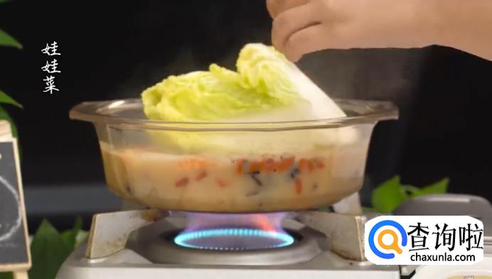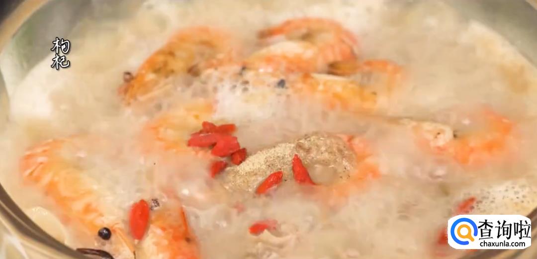 煲羊虾:另起一炖锅,放入煎好的羊肉和热水,大火烧开后撇去浮沫,转小火炖40分钟;40分钟后汤色会白,这时放入煎过的虾,加盐、胡椒粉、枸杞、娃娃菜,煮熟后关火。