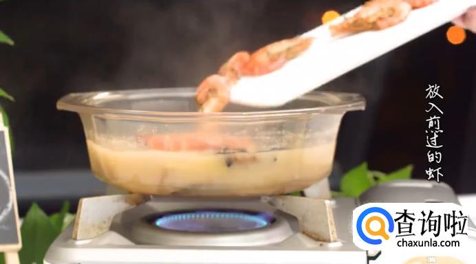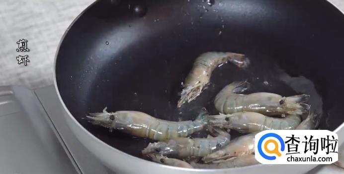 煎虾:热锅起油,放入鲜虾煎制,待虾身弯曲变红后盛出。