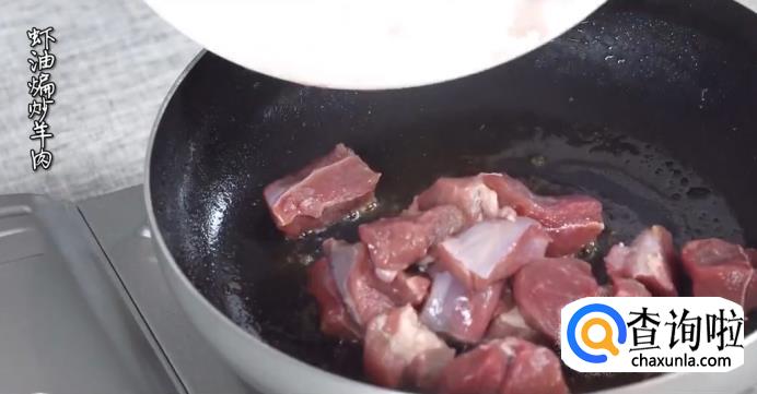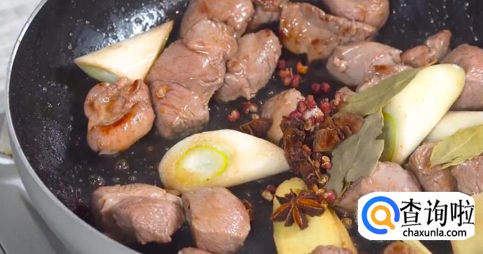 煎羊肉:将羊肉放入煎虾剩余的虾油中煸炒;炒至羊肉表面微黄放入姜片、葱段、香叶、八角、花椒、少许料酒炒匀后盛出。