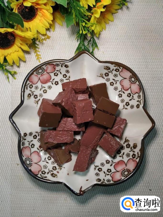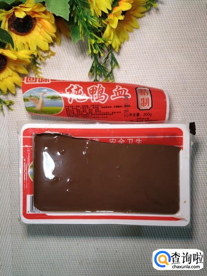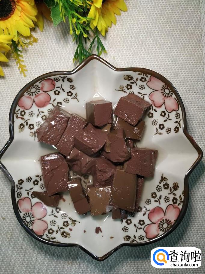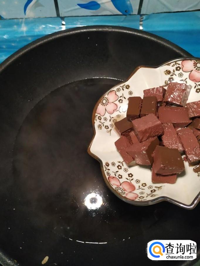 准备一块新鲜的鸭血,取出适量,切成块,放入盘中备用。小贴士:可以将鸭血倒扣在盘中,再切块。