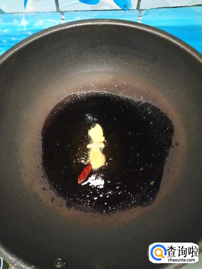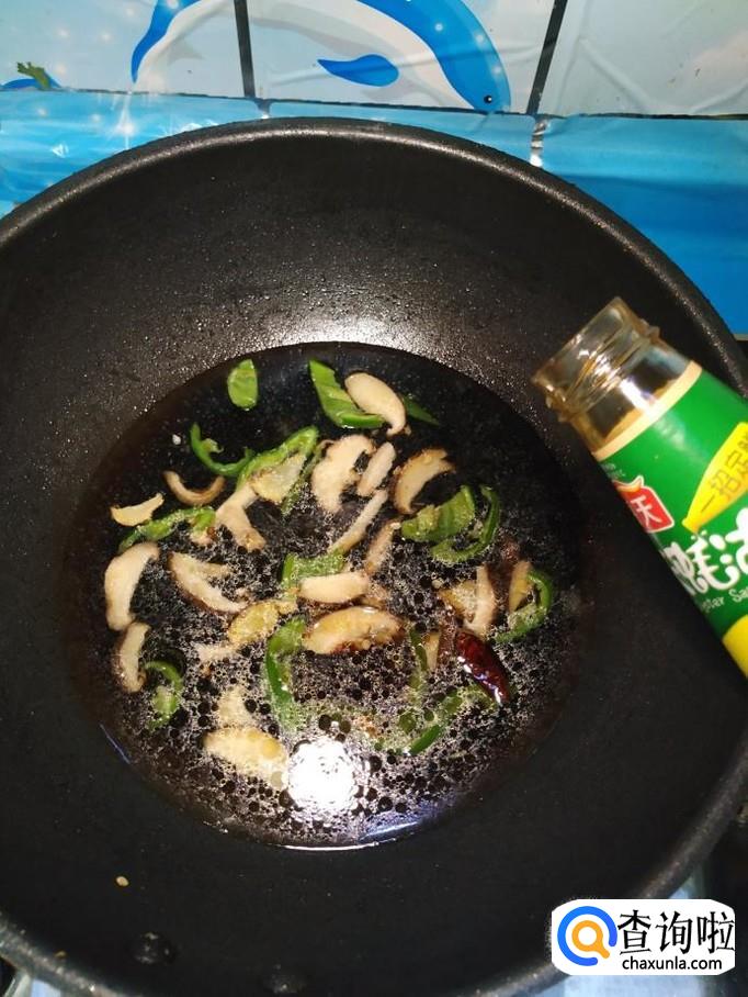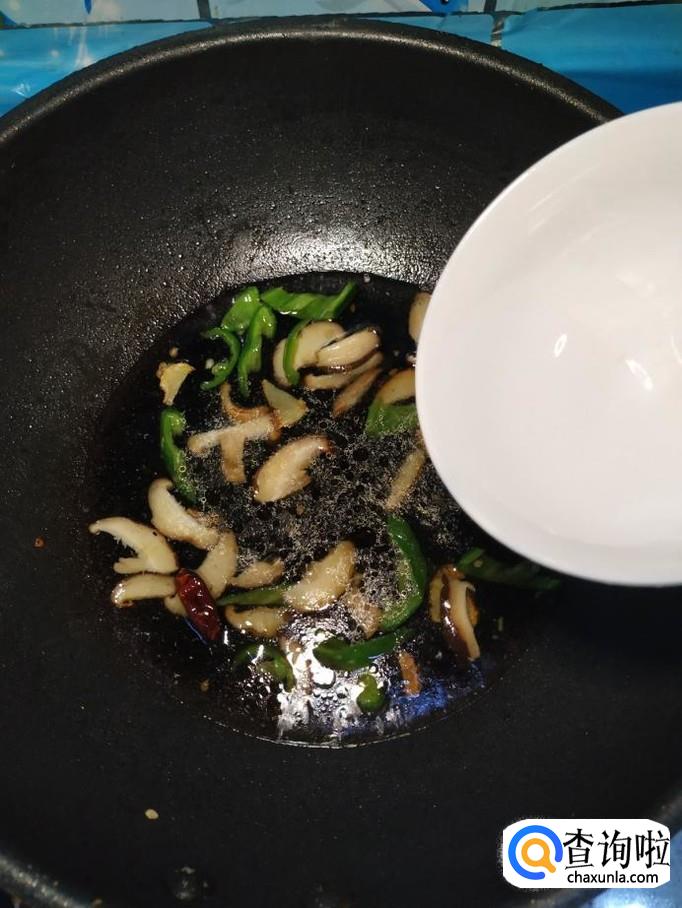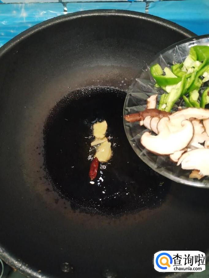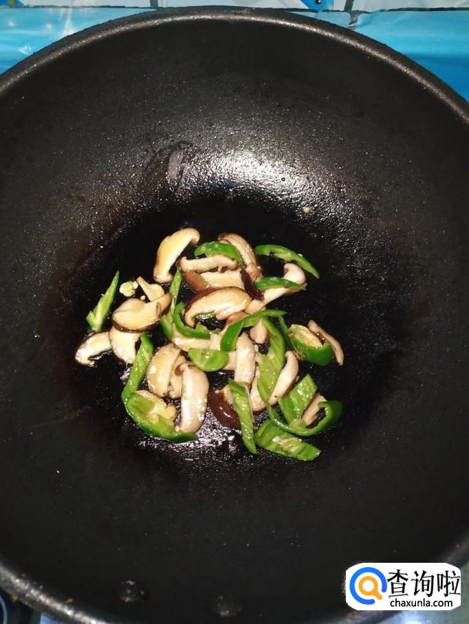 炒锅中放入适量油,油热后,将蒜片和干辣椒放入锅中炒香,然后将香菇片和青椒丝,放入锅中,翻炒均匀。小贴士:油的量不要太多。
