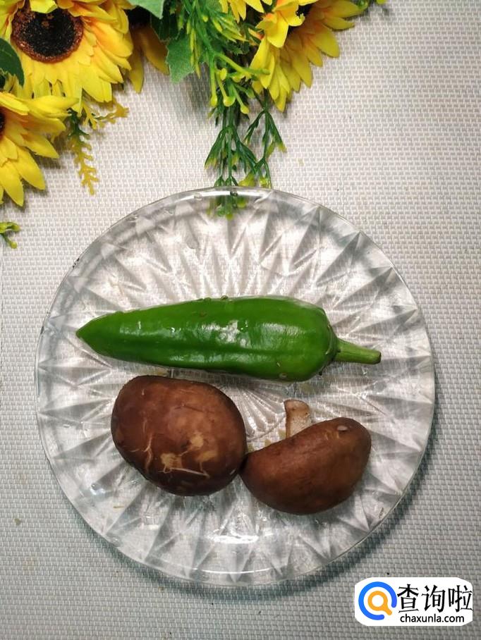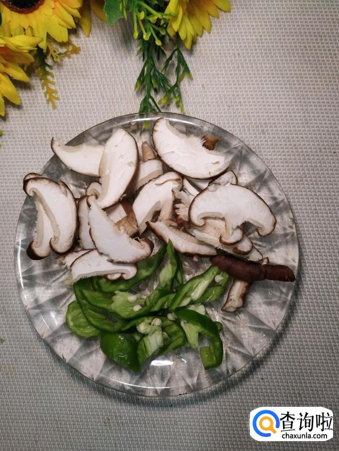 准备适量香菇和青椒,洗净后,将香菇切片,青椒切丝,放入盘中备用。