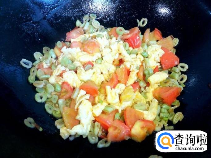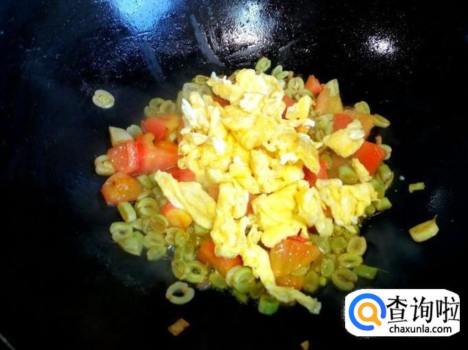 炒至芸豆变软,放入西红柿翻炒,放入盐。炒至西红柿变软,放入炒好的鸡蛋。