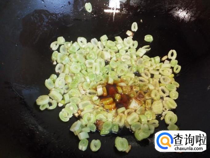 锅里放入油加热,油热后放入葱,姜,爆锅,随即放入芸豆翻炒,放入五香粉,适量蚝油。