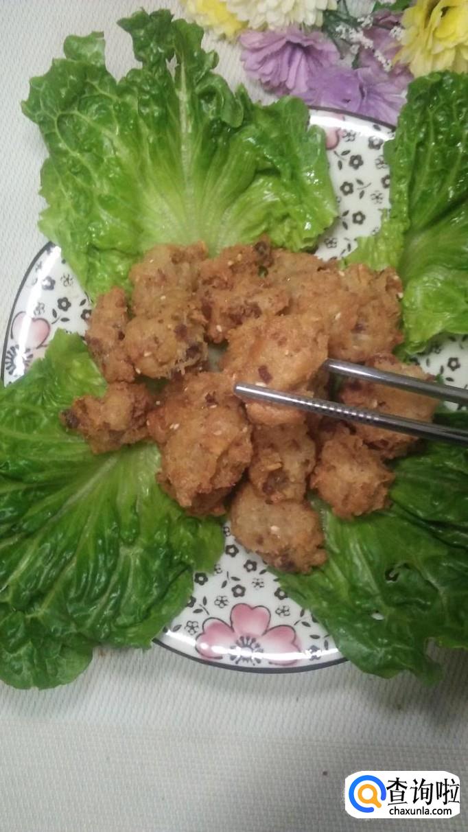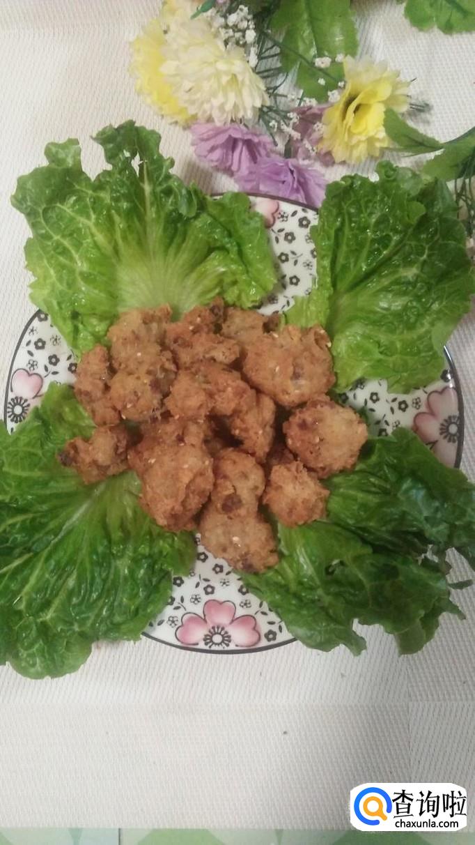 煎至金黄酥脆,捞出沥油,盘中放入生菜,将牛肉丸放在上面就可以吃了,特别美味。