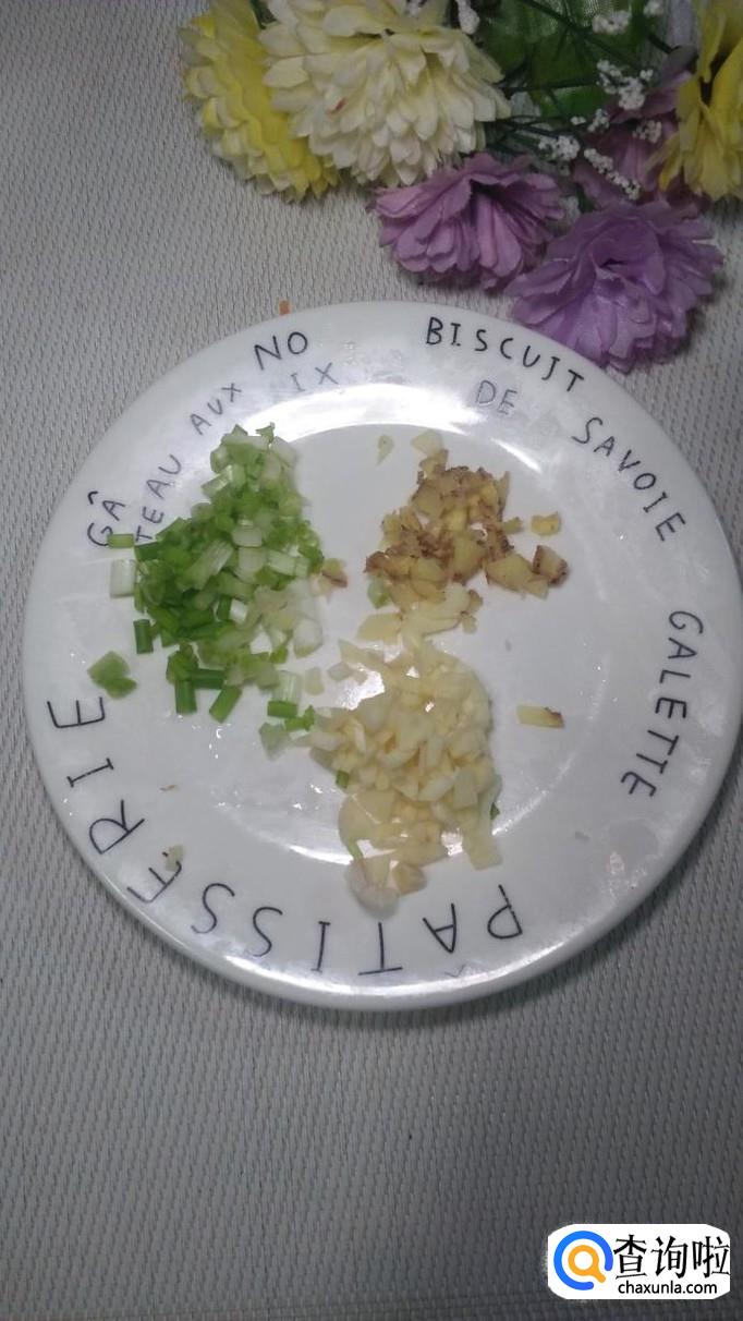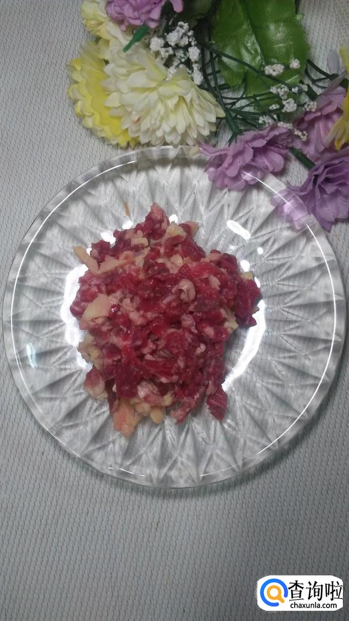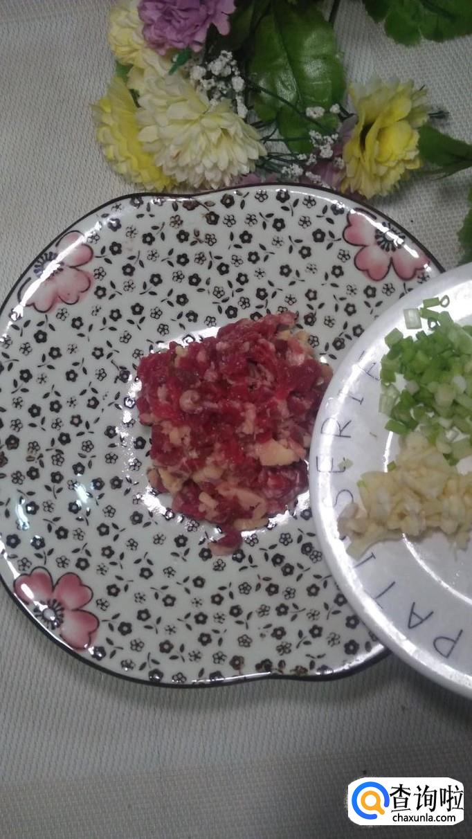 先将牛肉切碎,再将葱,姜,蒜分别切成碎末,然后将馒头剥去外皮。