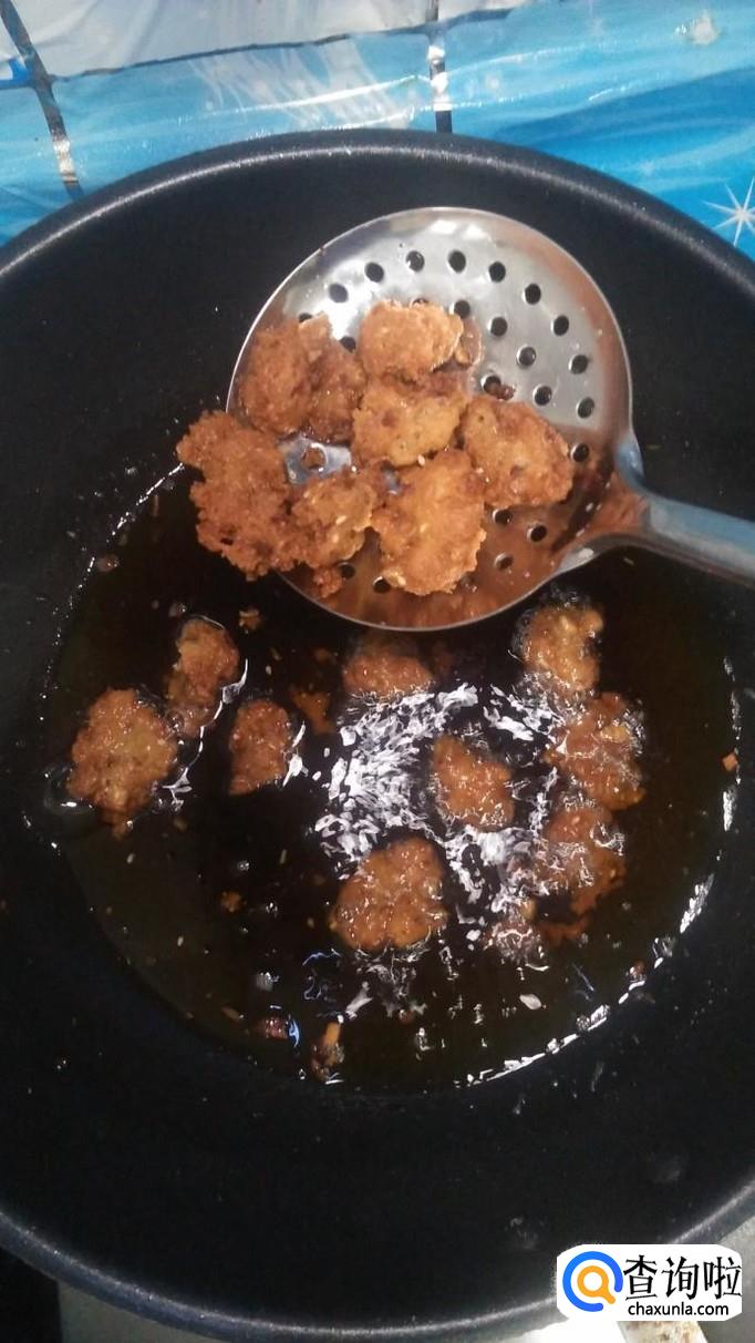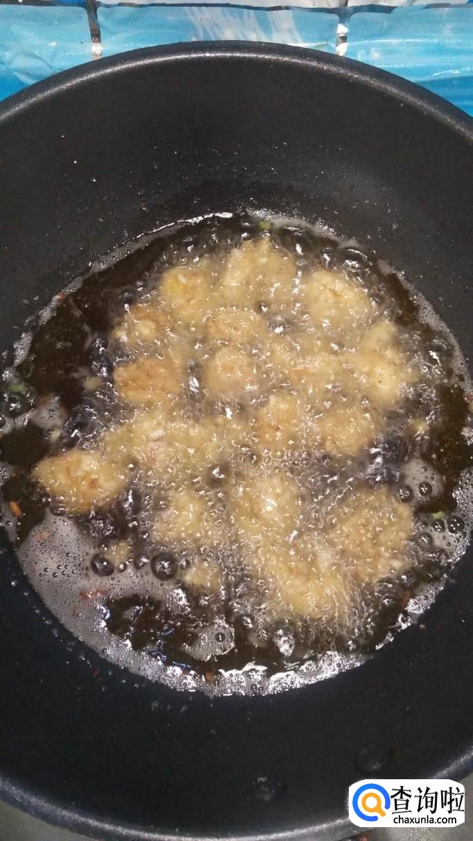 锅中烧热油有没有五成热,用勺子或者用手虎口处捏一下,做出丸子状,将丸子放入锅中,小火慢炸。